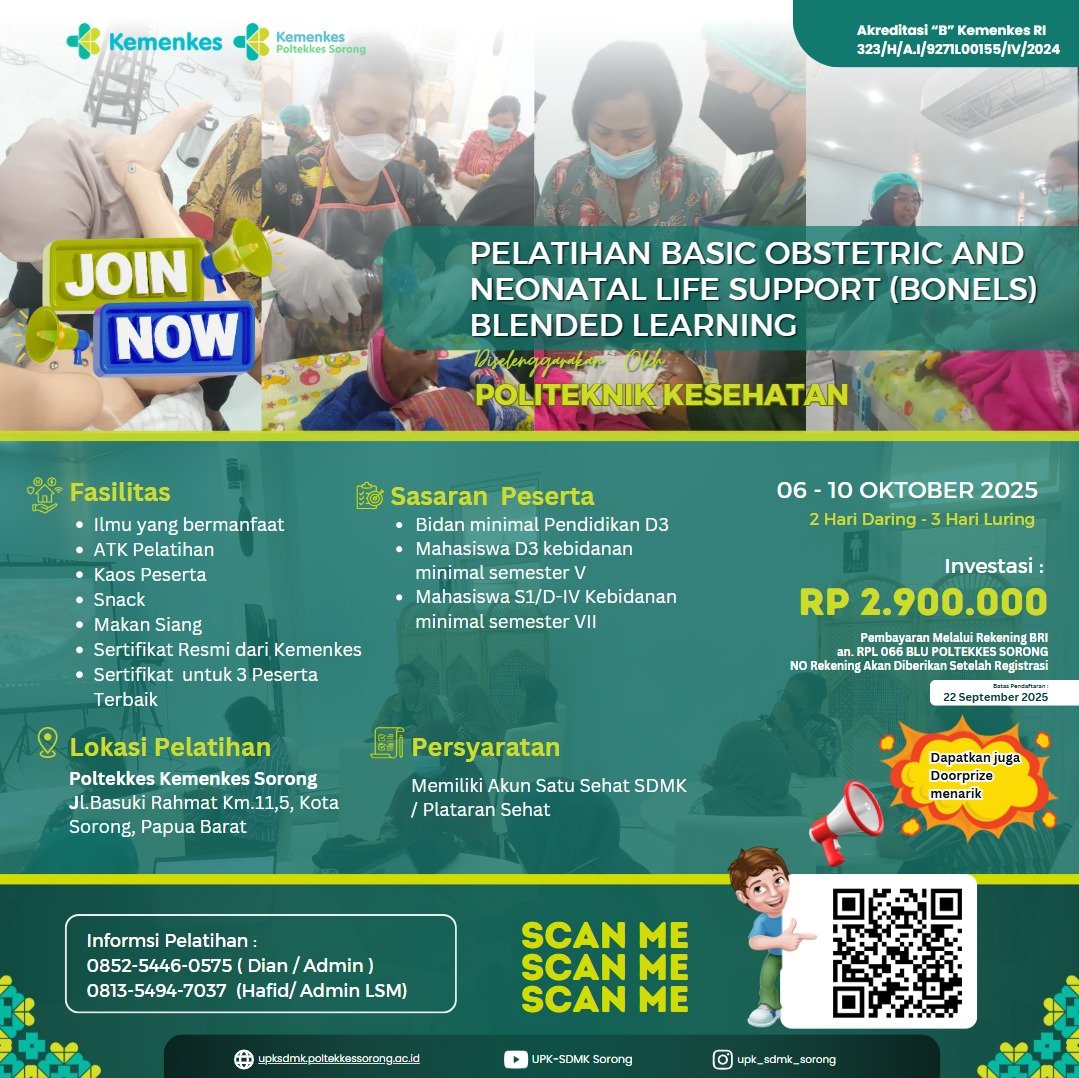 Unit Pengembangan Kompetensi Sumber Daya Manusia Kesehatan (PKSDMK) Sorong, Poltekkes Kemenkes Sorong membuka pendaftaran Pelatihan Basic Obstetric and Neonatal Life Support (BONELS) dengan metode Blended Learning.