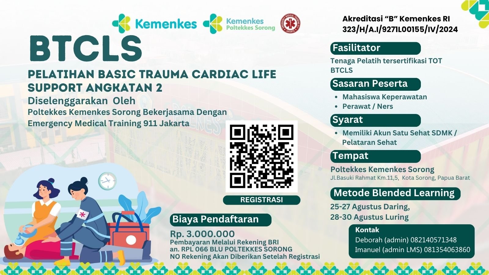 Pendaftaran BTCLS (Basic Trauma Cardiac Life Support) yang diselenggarakan oleh Poltekkes Kemenkes Sorong bekerjasama dengan Emergency Medical Training 911 Jakarta.